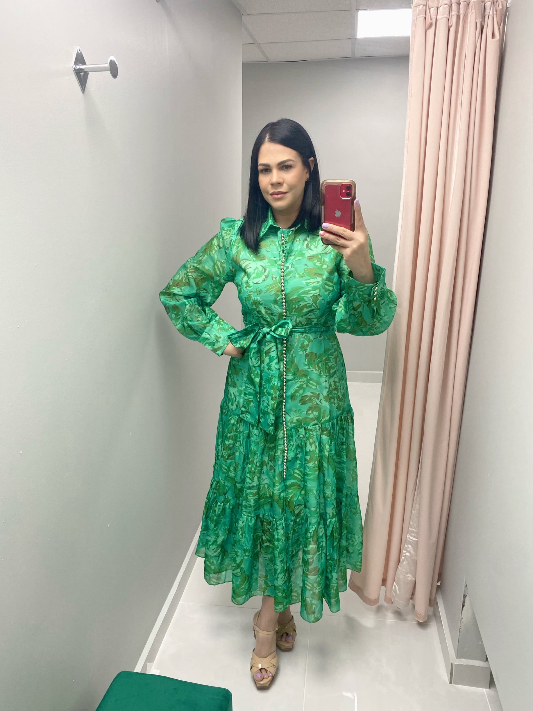 - Vestido Maxi, con estampado de Flores y hojas verdes