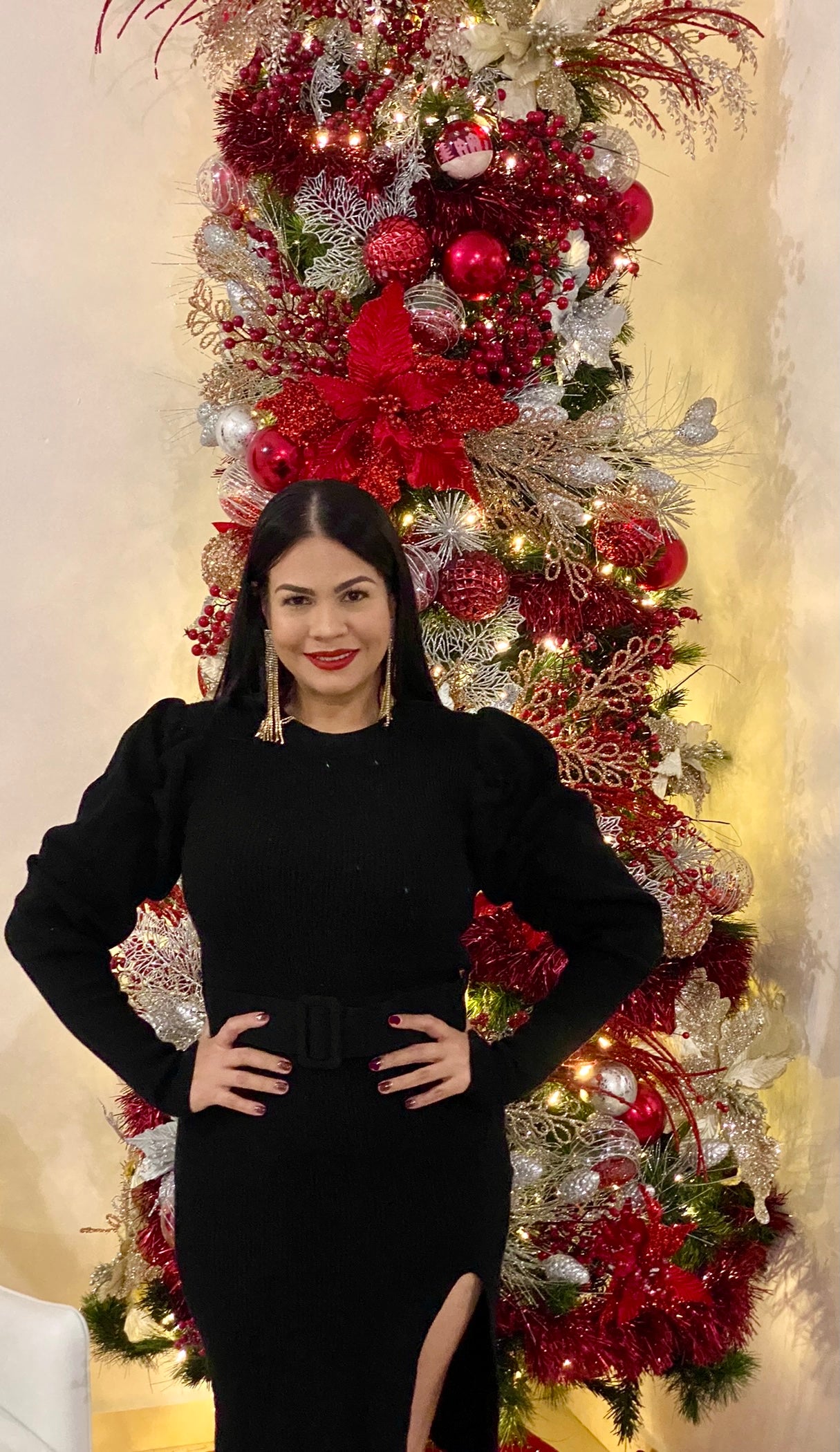 This ribbed knit midi dress features a round neck, long puff sleeve, midi dress length with belt.