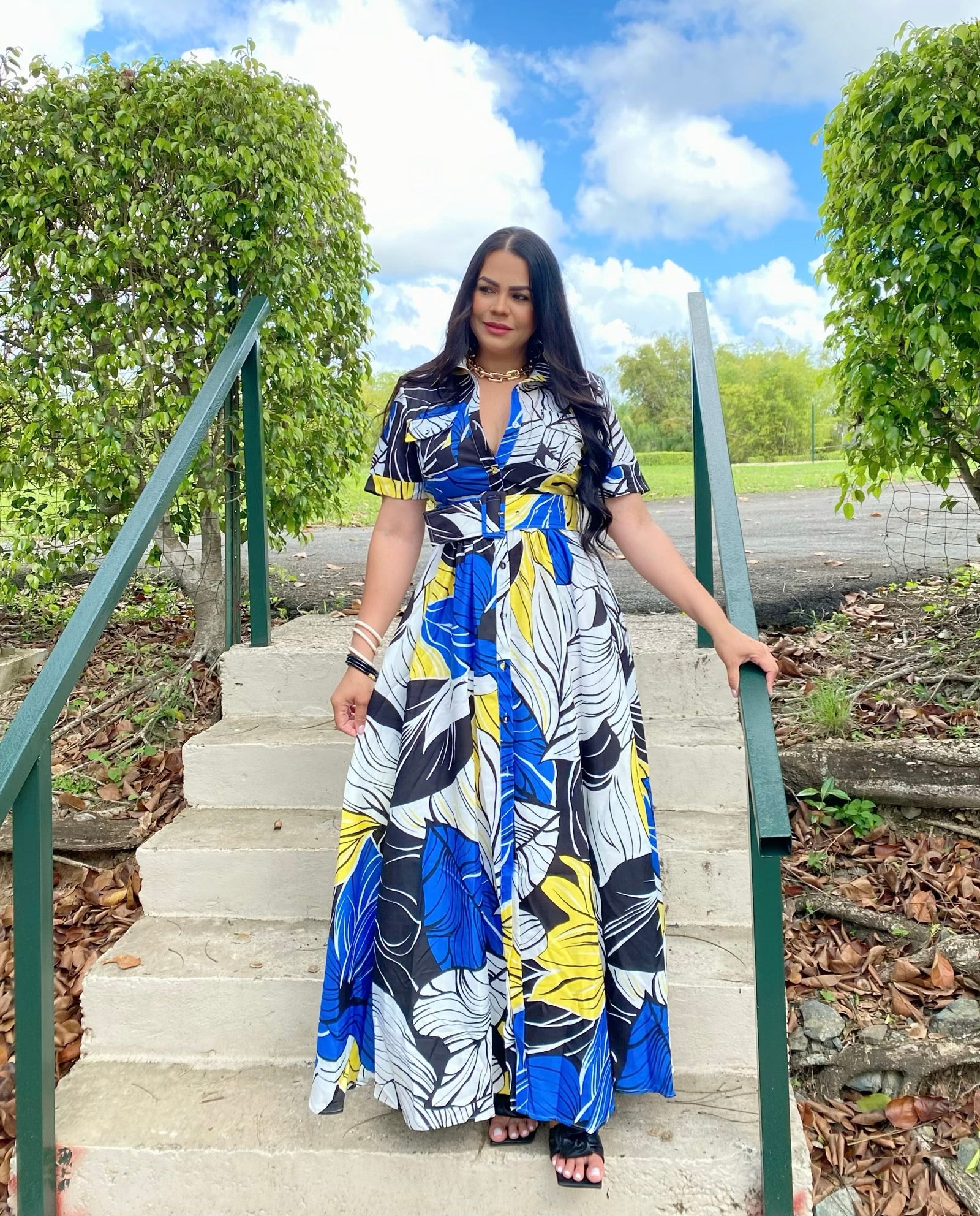 Blue, yellow, white and, black leaf print. Short sleeve, buttons up with functional patch pockets on the chest cuffed sleeves and removable belt.