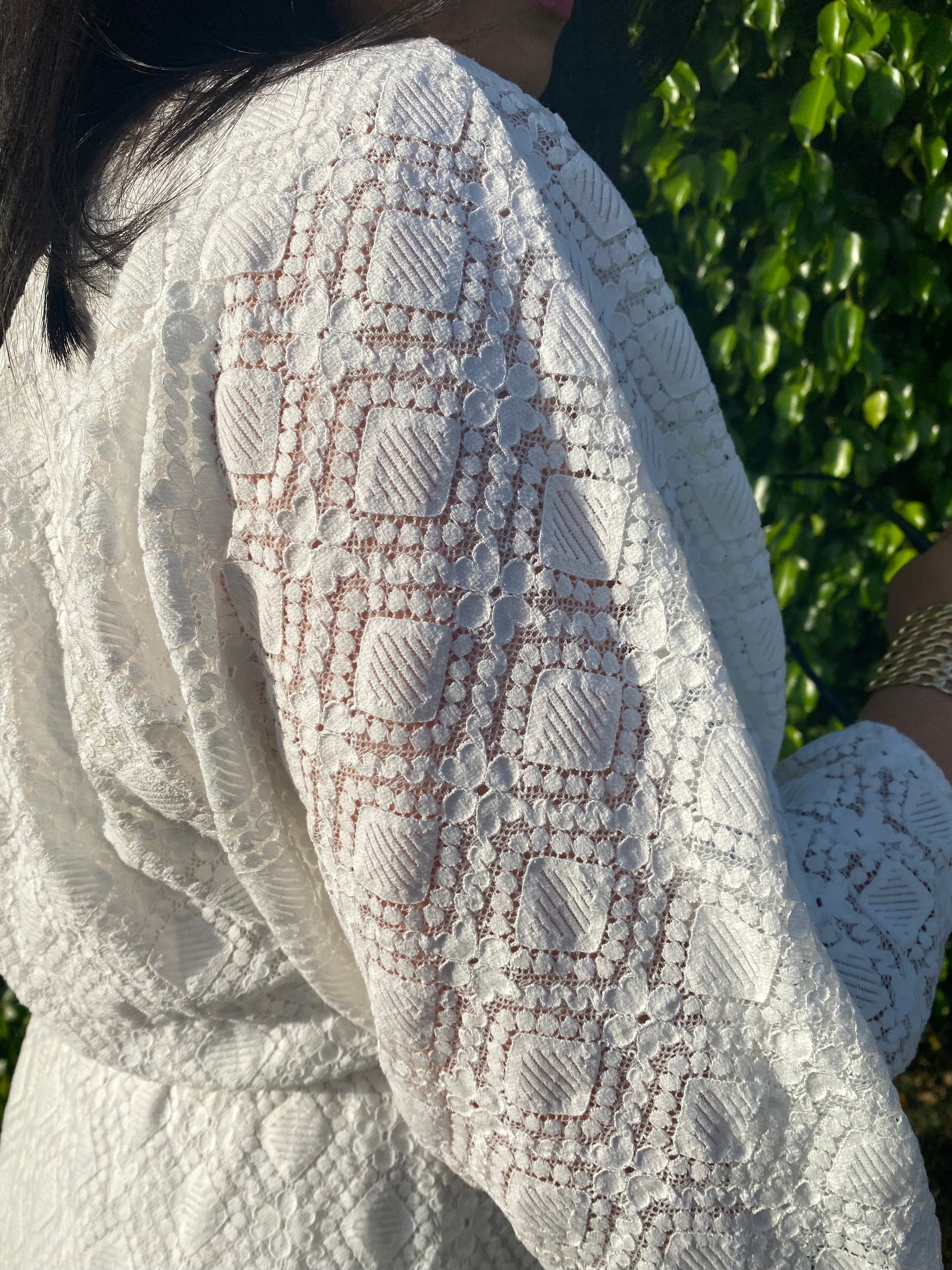 A textured woven romper featuring surplice neckline, elasticized waist with self sash tie, and bell sleeve.