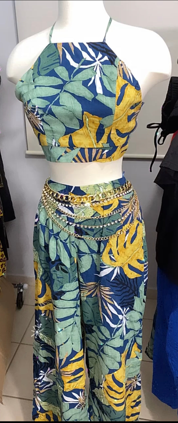 Printed Woven Top and Pant set. The Top back has thick straps, and spaghetti straps sleeves, so you can adjust them. The pant is high waisted and has elastic waist band in the back.