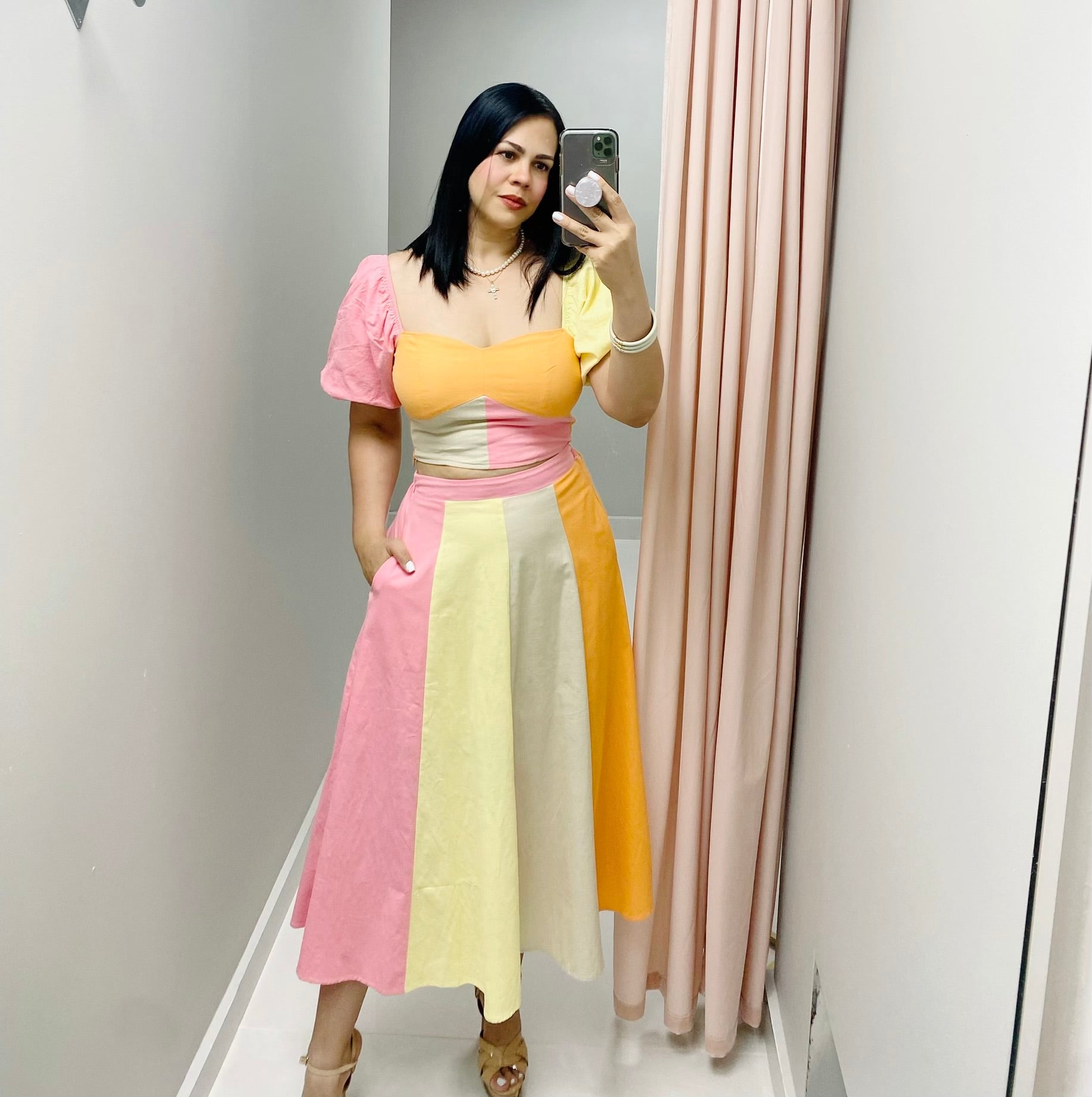 Heizel lleva puesto el Medium: mide 5’8” y sus medidas son: 40”-31”-42”. Tamaño de Brassiere es 36D