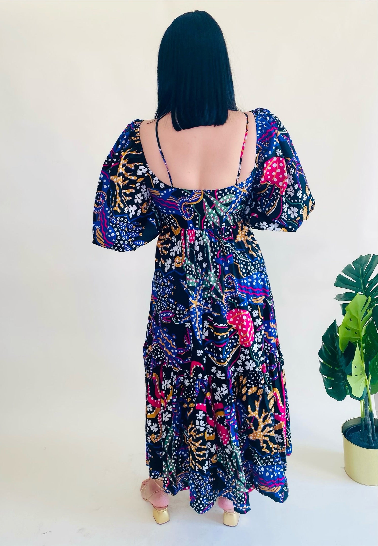 Square neck tie detail midi puff sleeve tiered skirt ocean print midi dress. Invisible zipper on the side