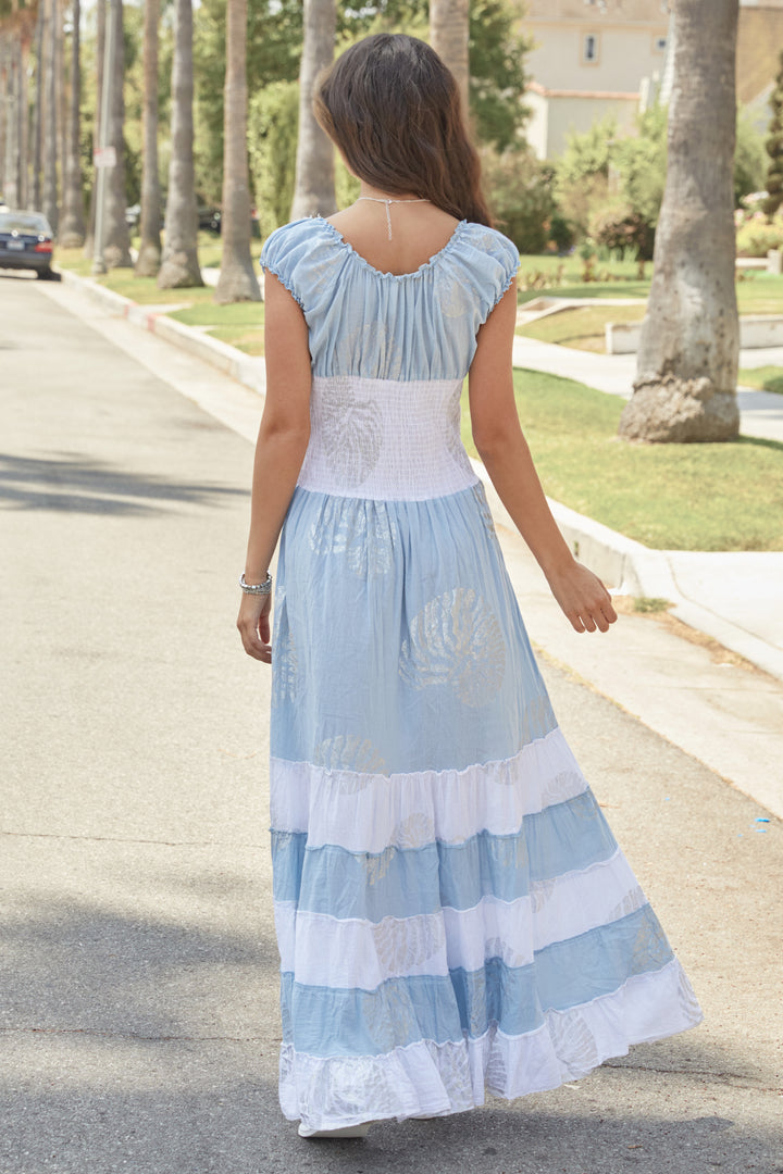 Floral beaded embellished low V-neck, smocked waist, color blocked bottom Linen Maxi Dress.