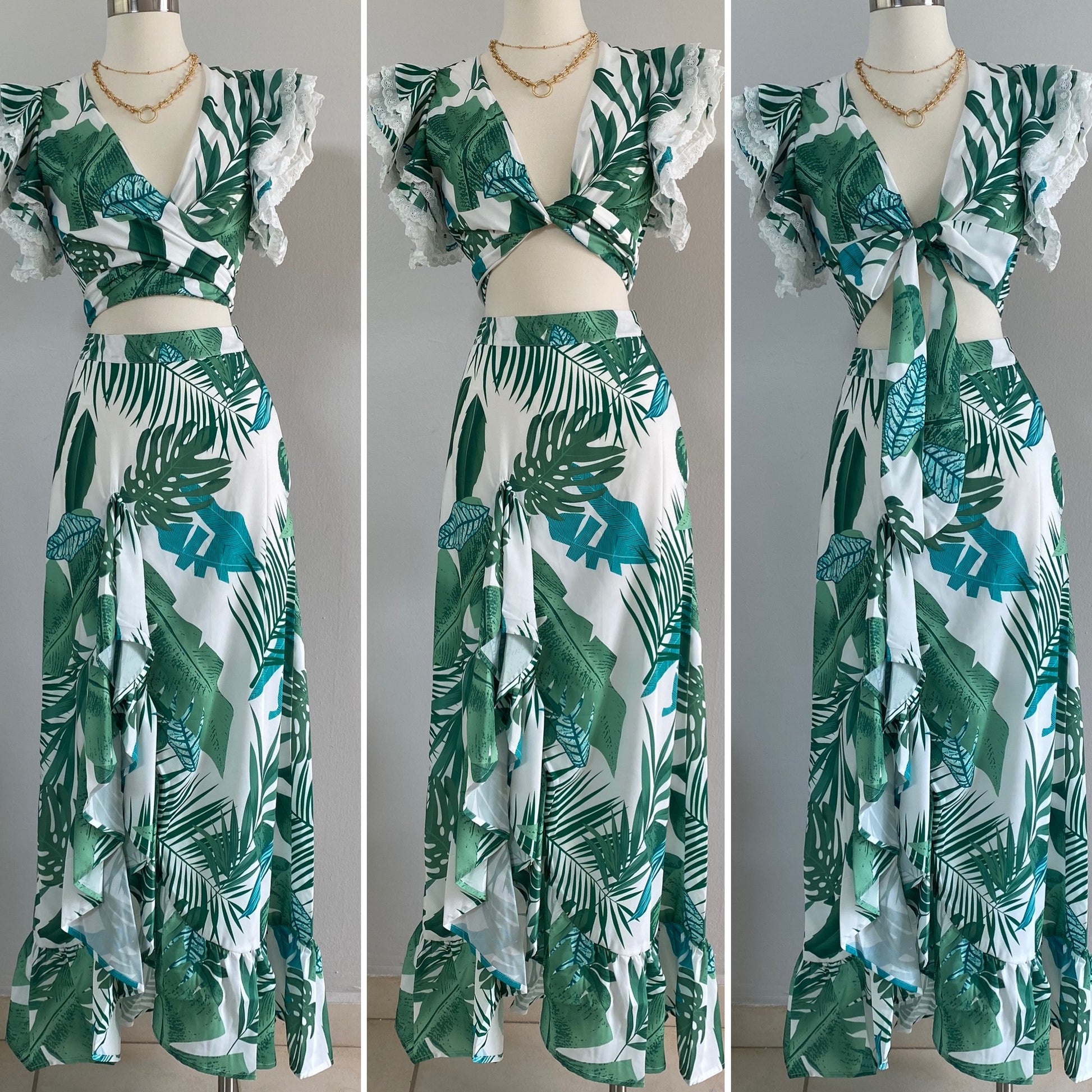 Green Palm leaves print with ruffles skirt. The top is wrap around and has ruffle sleeves and eyelet in borders.