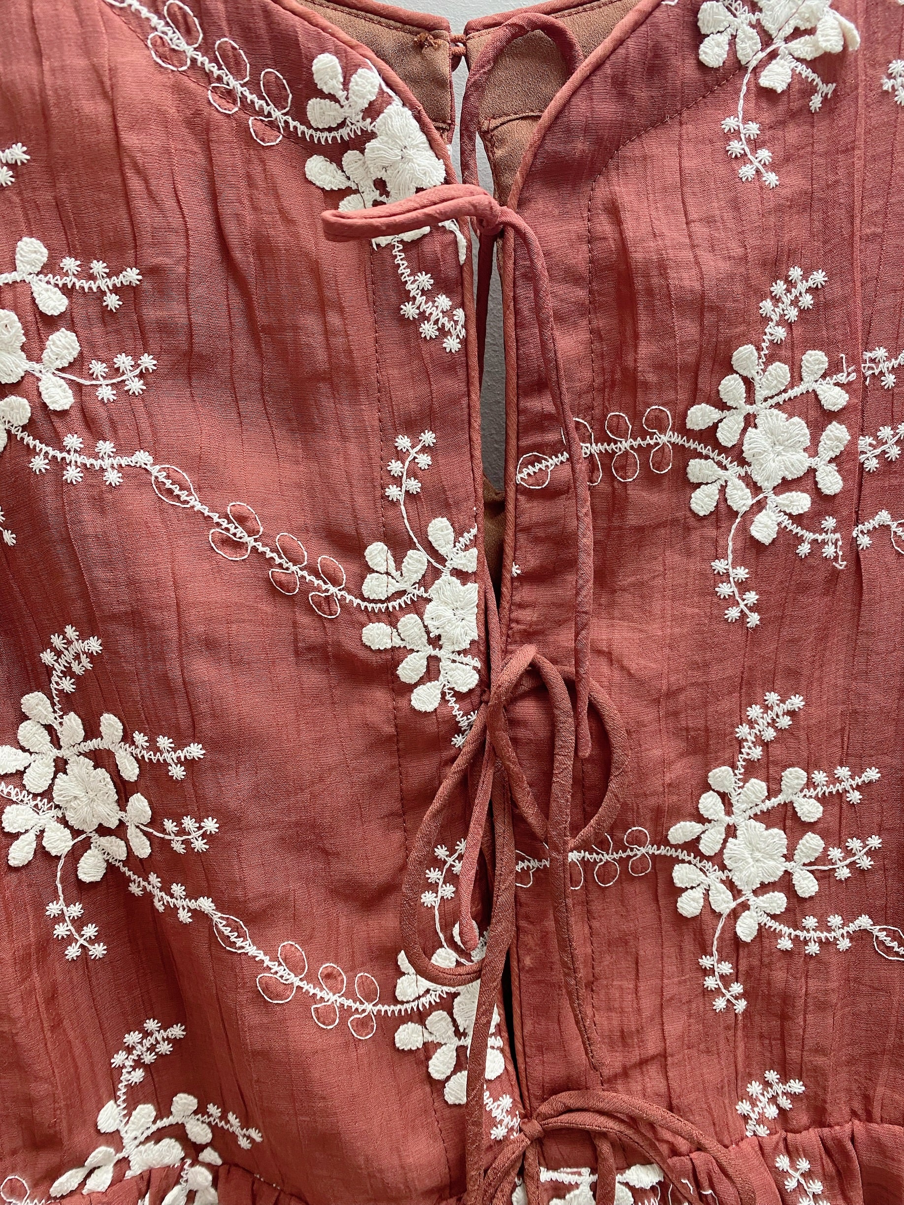 bohemian-inspired look with delicate and swirling embroidery.
